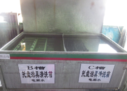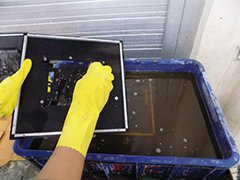 2009年度から、東芝テックシンガポール社とテックインドネシア社で、溶剤再生装置を導入し、IPA回収・再生による投入量・排出量削減を行っています。この装置で、使用済みのIPAの残留物を分離することによって、元の状態の溶剤に戻します。結果、IPAの95%がリサイクル・再利用可能となりました。
