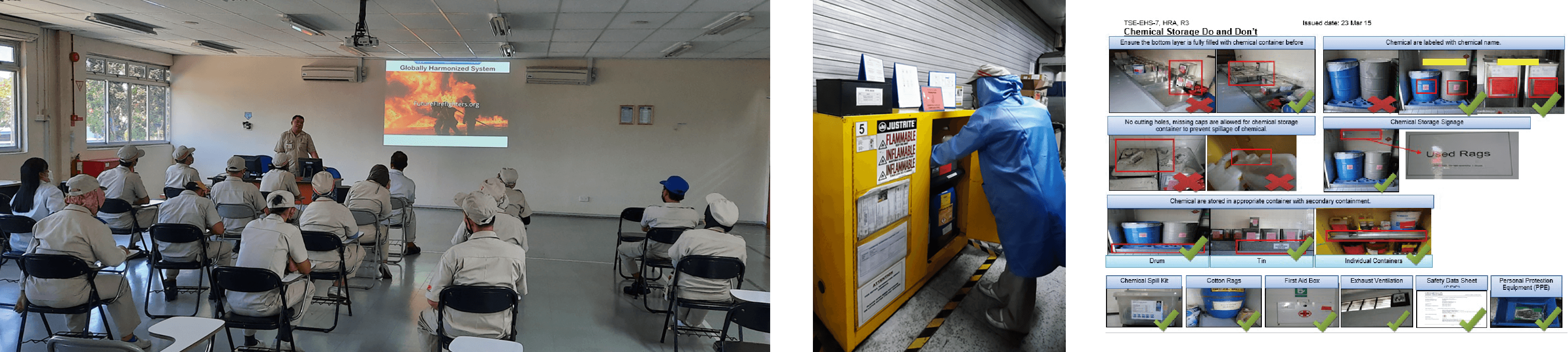 製造ラインで実際に化学物質を扱う化学物質取扱管理者と取扱責任者、および安全担当者を対象に化学物質管理についての集合教育と製造工程で適正な管理と使用方法について実務教育を行っています。また、定期的に化学物質保管倉庫、職場内化学物質保管庫のパトロールを行い、指示書に従った適正な管理が行われていることを確認しています。