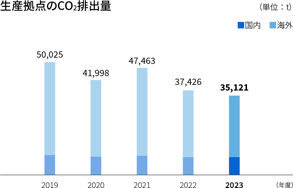 海外拠点を中心にLED照明への切り替え、省エネ設備への更新を補助金制度を有効に活用し、計画的な実施により、排出量の削減を継続しています。