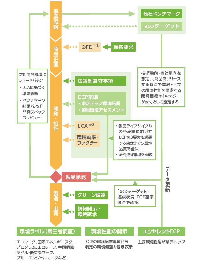 そのうえで、製品・サービスに求められる各種規制の遵守を確認するとともに、製品・サービスのライフサイクルの各段階で必ず達成すべき環境性能として「ECP※の3要素」を考慮したECP基準を定め、管理することで、製品・サービスの環境品質を確保しています。