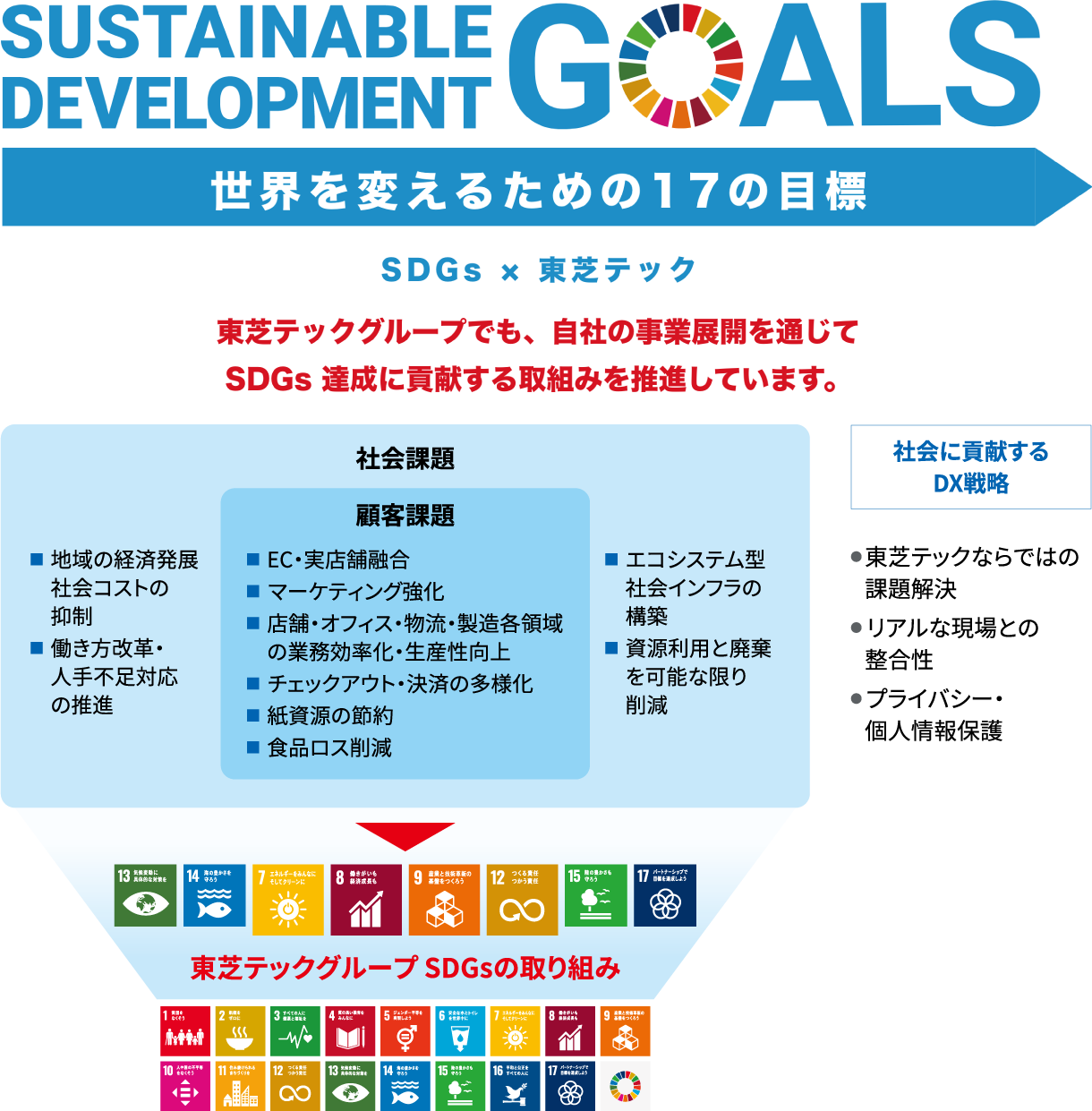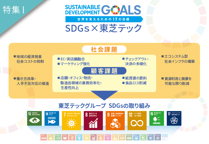 東芝テックは、店舗・オフィス・物流・製造各領域の課題解決に貢献するソリューションパートナーとして、お客様とともに、SDGs達成に向けた取組みを推進してまいります。