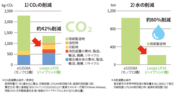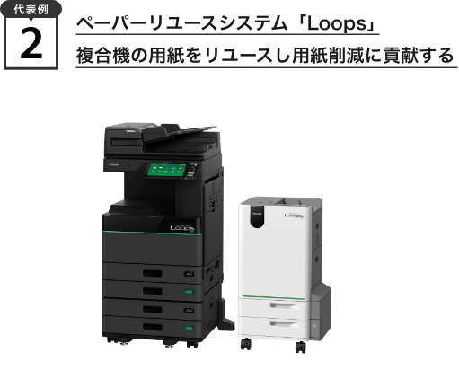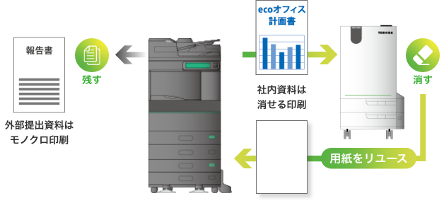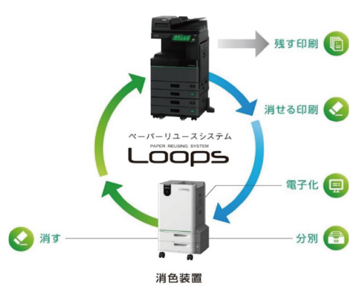 Loopsは、従来のコピー用紙に印刷・消色することが可能で、同じ用紙を繰り返し利用することができるシステムです。外部提出資料や保存したい文書には通常の「モノクロ印刷」、FAX受信やチェックシートなどの社内資料には「消せる印刷」を1台で使い分けることができるため、従来のワークスタイルを変えることなく、紙の使用量を抑制することができます。消色と同時に書類の電子化を行うことで、用紙の滞留を防ぎ、紙書類と電子データの理想的な循環を実現します。