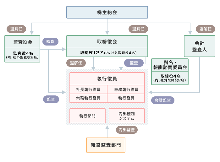 経営監視面では、取締役による業務執行の監督、監査役による監査、外部会計監査人による会計監査を実施するとともに、経営監査部門による内部監査を実施しております。