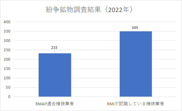 責任ある鉱物調査の結果、サプライチェーン上にRMIが 精錬業者と認識している業者のうち、349の業者を特定しました。このうち233業者はRMAP適合 精錬業者であることを確認しました。(2022年11月30日時点、添付調査結果グラフ)。