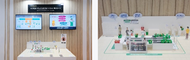 ミニチュア模型の展示では、買い物カゴが順次、手が空いたチェッカーのもとへ自動搬送される仕組みを紹介。これにより、新人チェッカーでも自分のペースで無理なく商品をスキャンできるようになります。また、お客様は待ち時間を活用し、近隣店舗での買い回りを済ませられるため、商業施設全体の回遊性向上も期待できます。