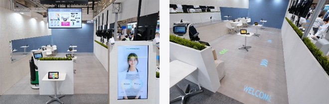 今回の展示では、大型ディスプレイによるセルフチェックイン、レーザー光でフロアに投影された矢印によるテーブルへの誘導、卓上タブレットを活用したキャンペーン・イベント情報の配信とオーダーの受付、さらにはスマホや自動走行ロボットによるセルフ決済などを組み合わせ、遊び心あふれるソリューションを紹介しました。来場者の反応は上々で、特にディスプレイとレーザー光の矢印を組み合わせたセルフチェックインは、クリニックなど異業種からも大きな注目を集めました。