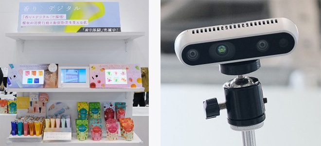 電子レシートサービス『スマートレシート』のデータ分析や、カート/スマホPOSへのリアルタイム販促など、東芝テックのデータソリューションを紹介するコーナーで注目されたのが、香りに関する消費者の反応を可視化する『香りリテールメディア』です。