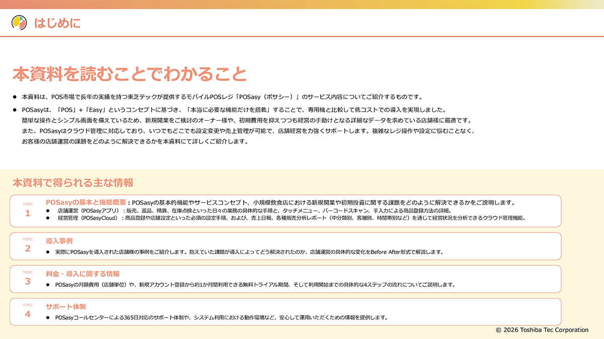 こちらは、東芝テックのモバイルPOSレジ「POSasy」に関する資料のダウンロードページです。
