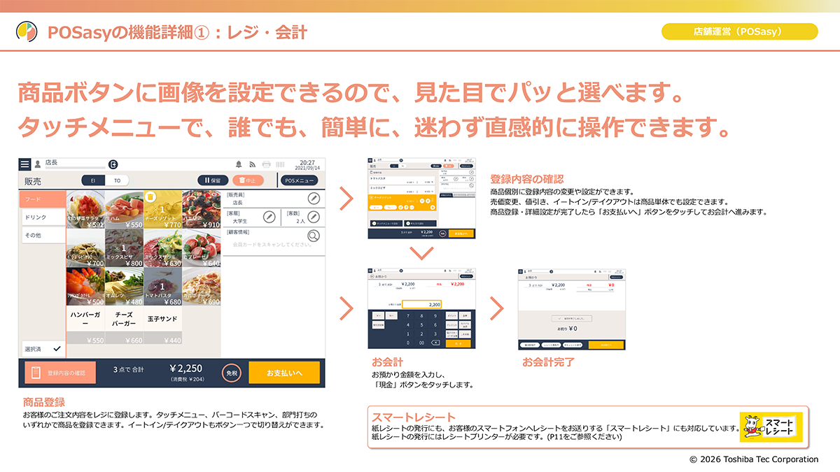 - 新人スタッフやITに不慣れな方でも、直感的に操作できる画面設計や、会計・売上管理・分析といった必須機能の活用イメージがわかります。