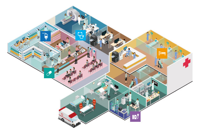 院内のあらゆる場面の課題解決へ…。先進の自動認識システムはもちろん、映像監視機器、病棟の配膳ロボット、処方箋・カルテなどの印刷に欠かせない各種プリンタにいたるまで、さまざまなご要望にきめ細かい提案でお応えします。
