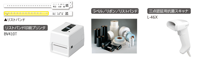 検査や処置などに必要なリストバンド、検体ラベルなどを印刷する小型プリンタやスキャナをはじめ、幅広い用途に応える多様なラベル/リボン/リストバンドをラインアップ。
