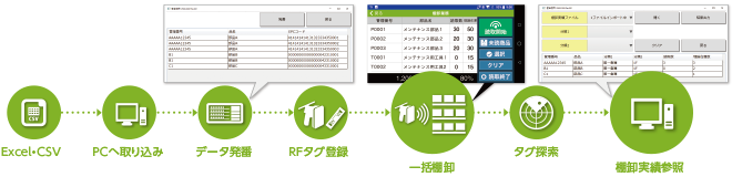 あらかじめ登録した備品データのRFタグを読み取り、備品混入を検知。