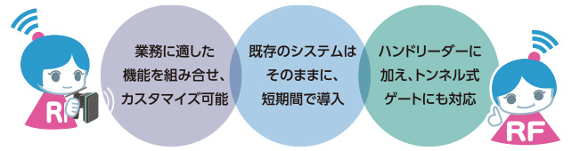 業務に適した機能を組み合せ、カスタマイズ可能 既存のシステムはそのままに、短期間で導入 ハンドリーダに加え、トンネル式ゲートにも対応 ピッキング・入庫・タグ書き込み機能も ※2020年3月対応予定図