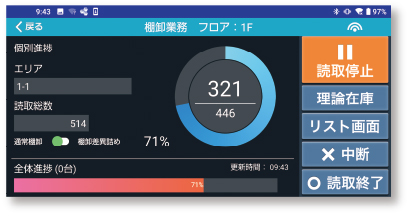 入荷検品RFIDハンドリーダーにより一括での棚卸を実現。自身の作業進捗はもちろん、全体の進捗状況もグラフで大きく表示。さまざまな現場の効率アップに貢献できます。