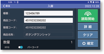 入庫(棚入れ)棚番はバーコードスキャン、商品はRFID読取による入庫作業が可能、入れ間違いを防止します。