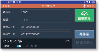 ピッキングピッキング指示書をスマートデバイス上で確認しながら、作業を実施。RFIDハンドリーダーにより、ピックした商品のバーコードをスキャンする必要がないため、スムーズなピッキング作業を実現します。