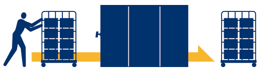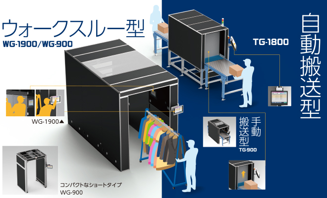 「ウォークスルー型」は、ハンガーラックやカゴ車もそのまま通せるワイドな間口で、作業性を高めるとともに高精度な一括検品を実現します。