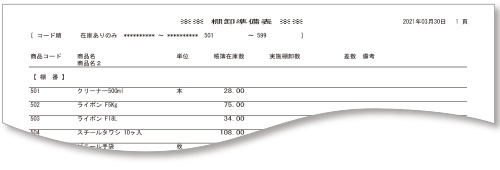 棚番ごとに帳簿在庫数を出力可能。実施棚卸数をメモし、棚卸モニタに入力できます。