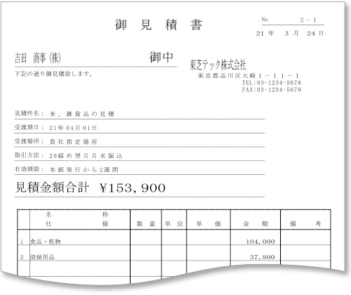 過去の見積書をベースに、簡単に見積書が作成可能。コクヨの見積書用紙(ウ-306)、及びA4用紙の出力に対応します。