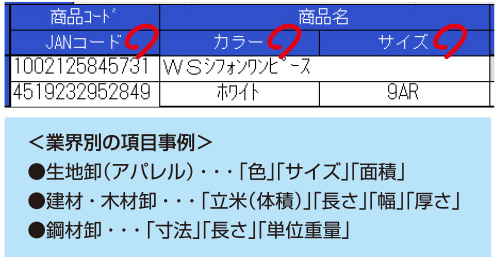「商品名」「単価」などに加え、生地卸業なら「色」「サイズ」「面積」、木材卸業なら「立米(体積)」など、業界特有の項目も追加可能。追加項目を伝票印字するだけでなく、追加項目で集計を行ったり、レポートの作成なども可能です。