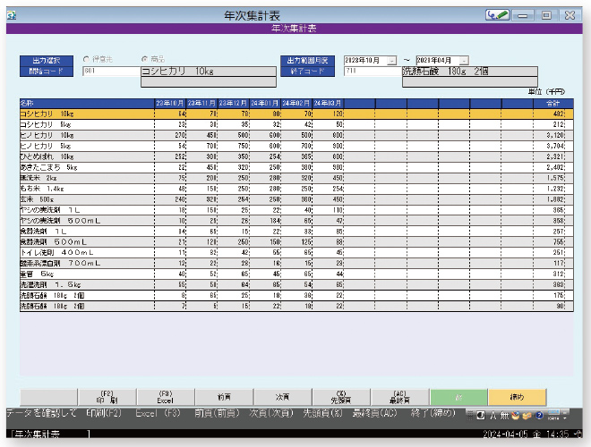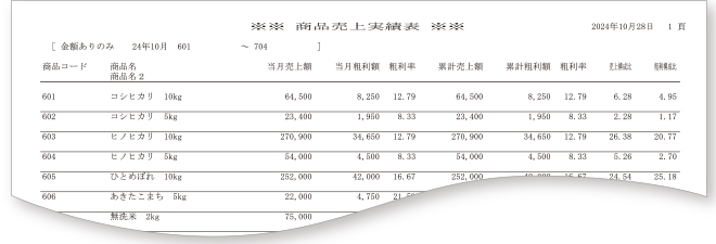 売掛残高一覧表、商品販売一覧表、売上集計表、入金種別一覧表、得意先商品一覧表、商品得意先一覧表