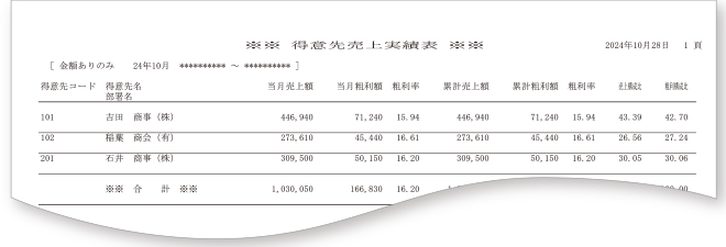 日々の入力データの蓄積から、多彩な集計・分析資料を自動作成。各種帳表は、伝票印字用のドットプリンタはもちろん、レーザープリンタ、FAX複合機、ネットワークプリンタへの出力等、多様な出力環境に対応します。
