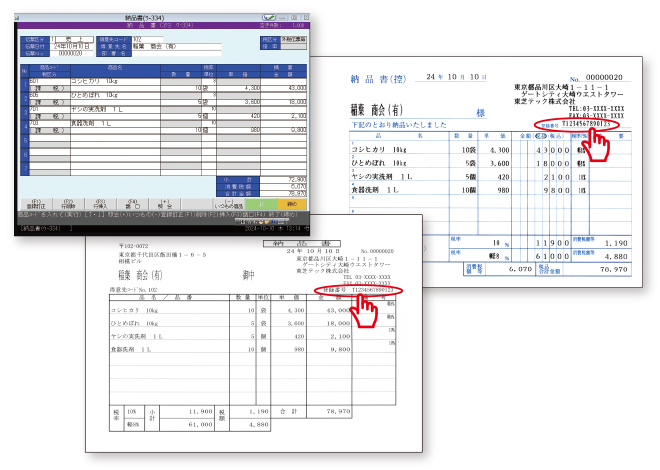 インボイス制度で必要な軽減税率および登録番号の記載に対応しています。