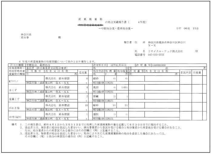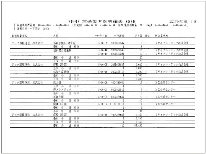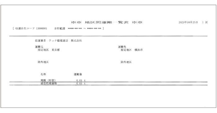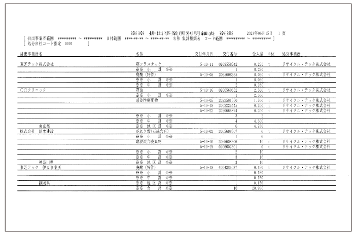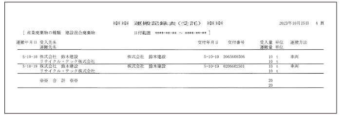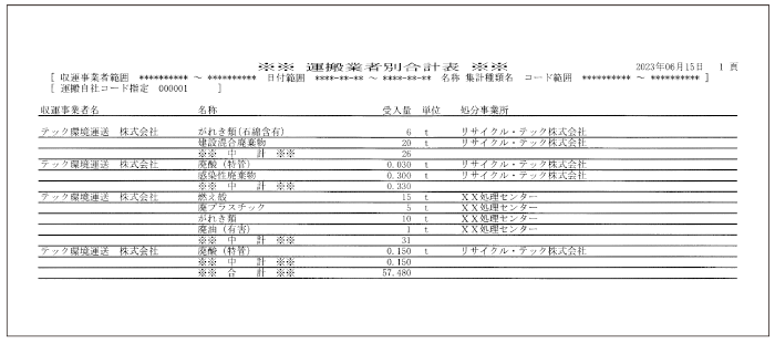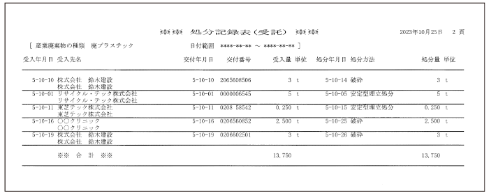例えばXX県から10t、○○県からは5tといったように、排出地区別に廃棄物の受入量が集計できます。