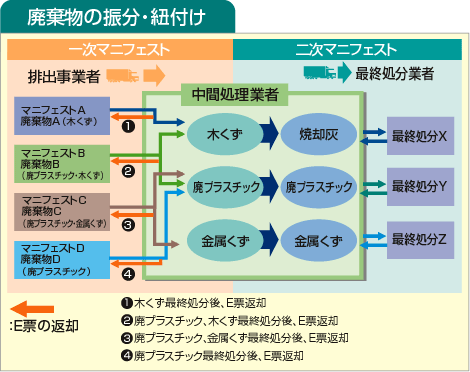 面倒な二次マニフェスト発行時の紐付け処理も、中間処理後の廃棄物量の計算で、自動的に一次マニフェストの候補を表示できます。