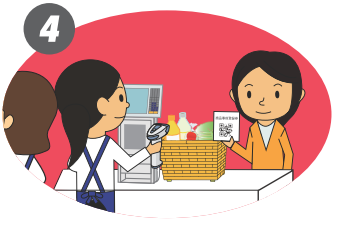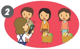 レジに並ぶお客さまの商品をハンディターミナルで事前に登録。レジではお客さまにお渡しした商品事前登録券を読み取り、すばやく会計できます。大切なお客さまのレジ待ち時間を緩和します。