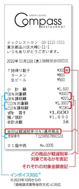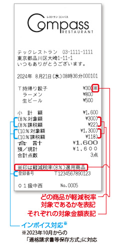 どの商品が軽減税率対象であるかを表記、それぞれの対象金額表記、インボイス対応