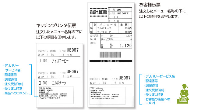 従来のキッチンプリンタ伝票、お客様伝票に詳細な注文情報を印字します。