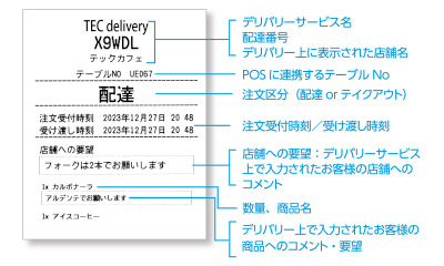 指定したプリンタにデリバリー・テイクアウト専用の注文伝票を発行します。
