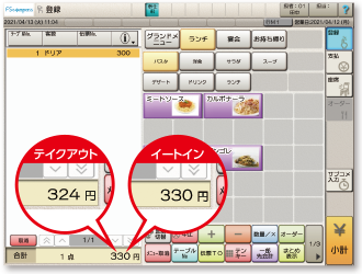 一つのメニューでテイクアウト(8%)とイートイン(10%)の税率切替が、売上登録時に可能です。