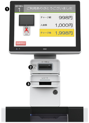 本体・ディスプレイ・プリンタ一体型のコンパクトな自社型電子マネーチャージ機。