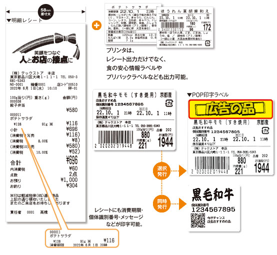 レシートでも。ラベルでも。ツインプリンタで使い方いろいろ、テックからのご提案。