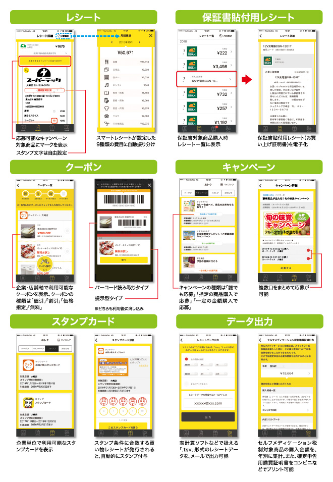 電子レシートの閲覧、集計、キャンペーンの応募、クーポン、スタンプカードの利用、レシートデータの出力などが行えます。