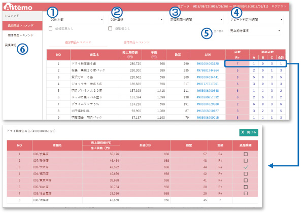 棚落商品レコメンド情報をお知らせ。各店舗にて販売実績が低く、リピート会員がいない死筋商品を特定し、新商品との入れ替えを各店舗に提案します。