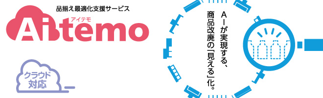 Aitemo(アイテモ)は、「追加すべき商品」と「棚落ちさせるべき商品」のリストを自動生成し、商品の改廃を支援するAIクラウドサービス。量販店のPOSデータを永年研究してきた東芝テック独自のアルゴリズム(分析方法)を活用し、バイヤー様へ納得性の高い情報を提供する新サービスです。