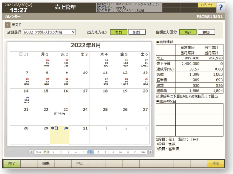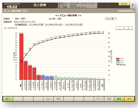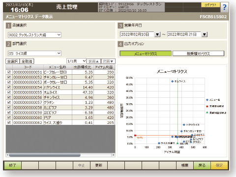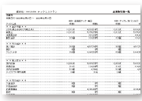 (営業日報/月報、店別日別売上一覧、店別月別売上一覧、店別日別営業一覧、タイム別、客層、売上種別、メニューマトリクス 、メニューABC、メニュー総括表、メニュー別デッシュアップ、メニュー別時間帯別出数、部門別レポート) - 監査