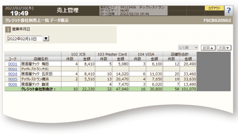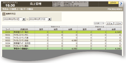 (全店売上一覧、全店営業一覧、店別取引別一覧、クレジット会社別売上一覧、予約ルート別売上一覧、店別FL確認表) - 店別個別管理