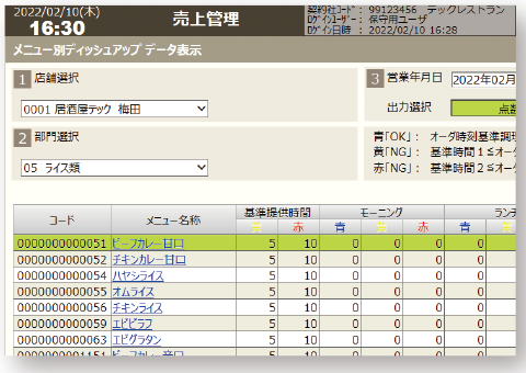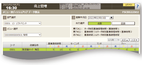 デッシュアップデータから各店舗内の厨房作業時間に問題がないかを確認することができます。