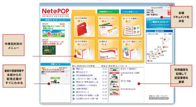 階層別フォルダ管理/コンテンツ配信機能/企画データ共有機能 ナレッジデータ共有機能/CSVデータ取り込み書き出し機能 本部システム連携機能/モバイル機器対応/キャッチコピー検索 POPマスタアイテム検索/多彩なテンプレート編集 画像アップロード機能/軽減税率対応/ユーザー権限管理機能 プリントログ機能/アクセスログ管理機能 |