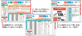 資材の作成は、格納原稿を開いて印刷指示をするだけの簡単オペレーション。データ更新作業が生じても作業内容に合わせて「リスト表示」「拡大表示」「カード表示」の3タイプから画面を選べます。