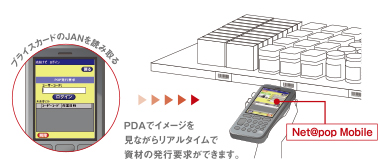携帯端末でイメージを確認しながら、売場から資材の発行要求ができます。