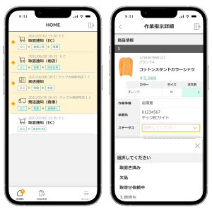 自店舗在庫欠品時に倉庫や他店舗の在庫を引き当て、発送指示をおこなうことができ、ECサイト経由の試着予約情報、商品受取情報をアプリに通知することが可能です。
