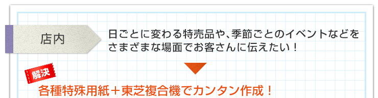 店頭POP、長尺ポスター、ショップカードなど、同じ内容のメッセージをさまざまな特殊用紙で作成できます。