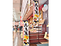 2018年12月の導入からまもなく、大型サインやPOPの制作を開始、活用範囲を広げてきました。最初に取り組んだのは、長尺エコクリスタルを3枚貼り合わせた三角柱状のサインでした。これまでは、出力したものをラミネート加工し、それを複数貼り合わせて三角柱を作っていました。1点制作するのに半日がかりだったものが、制作時間はわずか10分に短縮。視認性が高く、紙だけで自立し、軽量なのでテグスなどで吊り下げて掲示することもできます。
