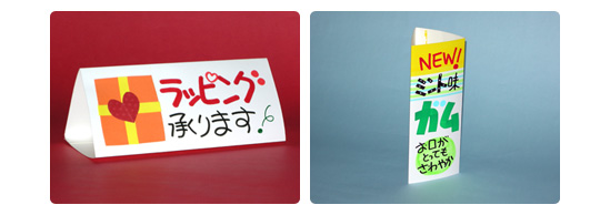 今回はエコクリスタルの大きな特徴の一つである折る・曲げる・切るといった加工を加えて、レジ回りの小物と商品周りのPOPをつくります。