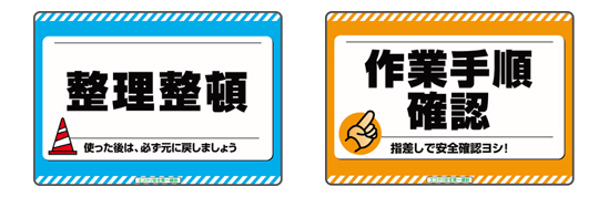 次にオフィスにあるサイン類で社内制作できるものはないか考えてみましょう。今回は様々な標識が掲示されている工場について考えます。工場の掲示物は、テレビや新聞の広告と違って、ブランドとしての高いクオリティを求められるものではなく、何を指示したいのか、掲示目的が明確なものですので、ほとんどエコクリスタルで作成できます。「整理整頓」「指差し確認」「手洗い励行」・・・タテ描き、横描きごとの表示設定、定型の小さなサイズの表示法やフォーマットを統一して作成すれば、美しくかつ企業姿勢を込めた制作物がつくれます。耐候性があり、濡れても拭くだけできれいになるエコクリスタルなら、ラミネートする手間も要らず、掲示物が簡単かつ大量につくれます。